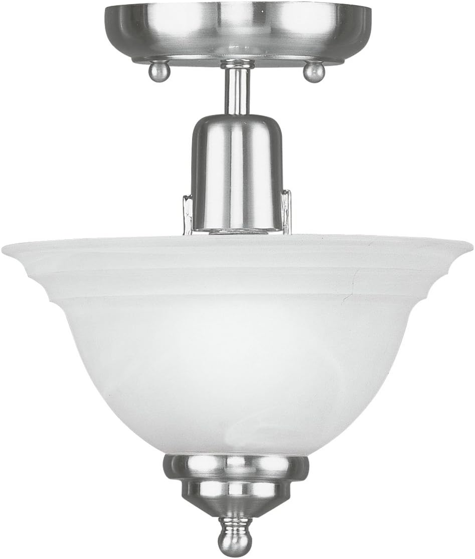 Livex Lighting has an exceptional line of quality products aimed to please even the most discerning of consumers. Relish in the design of this 1 light Flush Mount; from the details in the White Alabaster Glass, to the double coated Brushed Nickel finish, this Flush Mount is not only durable, but a tastefully elegant showpiece.